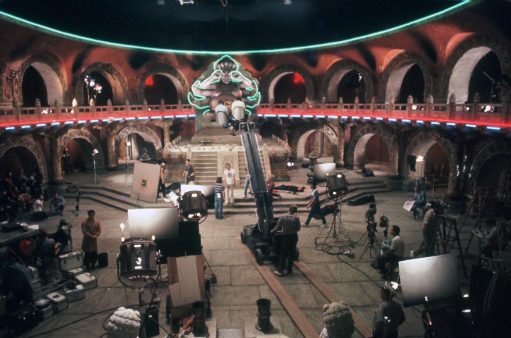 A neat behind-the-scenes photo of Victor Wong and crew in the Buddha-filled Hall of the Infernal Judge – courtesy of MovieStillsDB.com